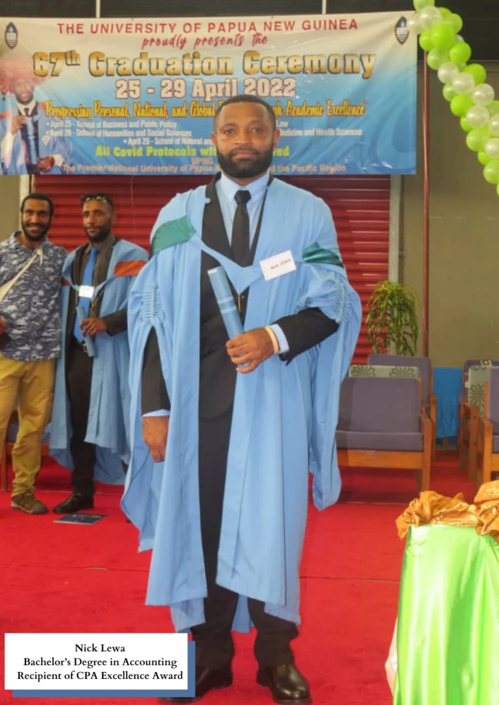 We would like to congratulate Nick Lewa (Bachelor of Accounting and Recipient of CPA Academic Excellence Award), John Oveai (Bachelor of Law), and Emmanuel Sarufa (Bachelor of Arts – Double Major in Political Science & Creative Arts).